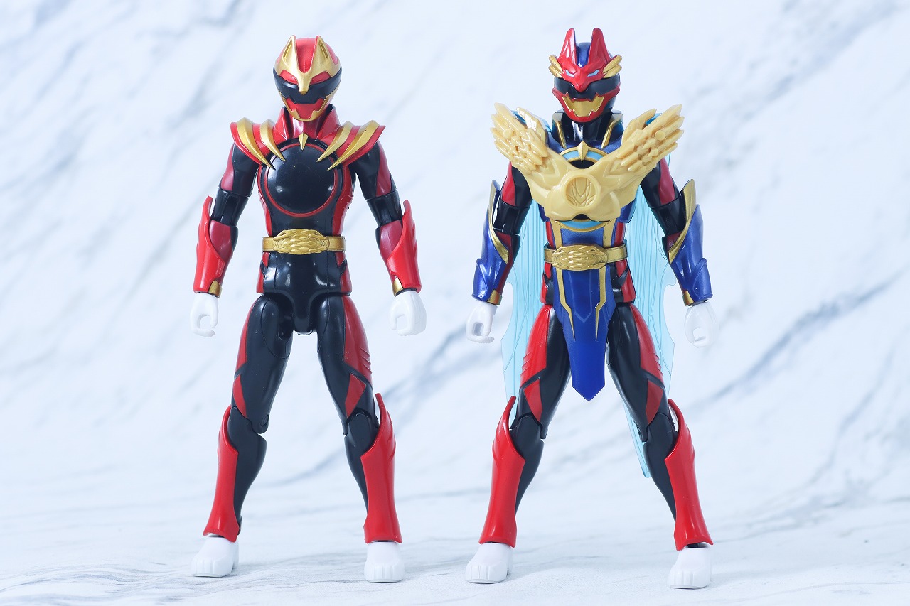 アクションヒーローのゴジュウウルフと比較。そのままアーマーが装着されているような姿なので、一気にごてごてした姿になっていますね。赤い色味については太ももの色が今回の方が明るくなっています。