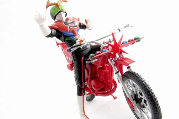 ちなみに旧アーツに合わせて発売された、S.H.フィギュアーツのカブトローに乗せてみる。こちらはストロンガー本体とセットになったテールが反ったデザインのカブトローです。サイズはやはり小さいですね。ハンドルを持つことができる手首パーツも無いので、かなり乗せづらいです。