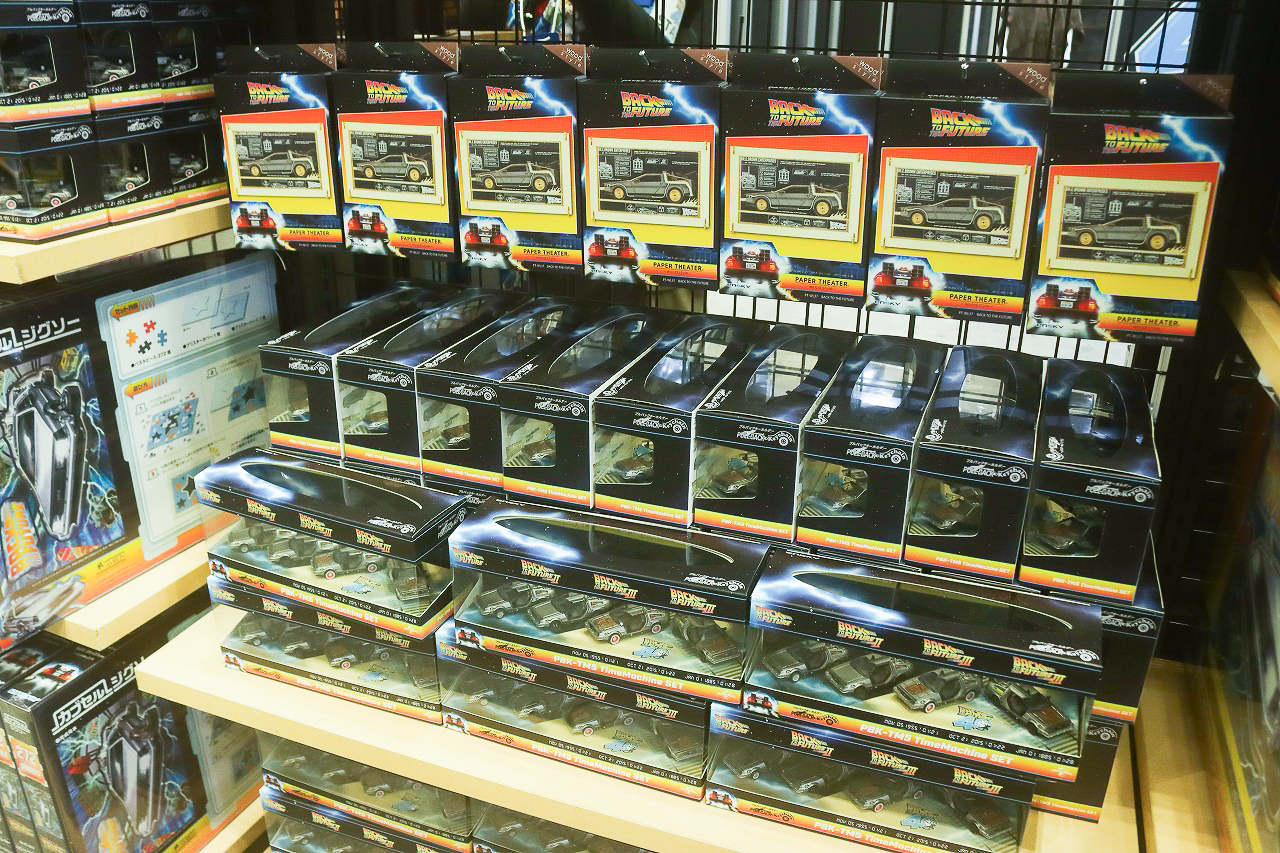 近年になって格段に増えた『バック・トゥ・ザ・フューチャー』やデロリアンのグッズも数多く並ぶ。